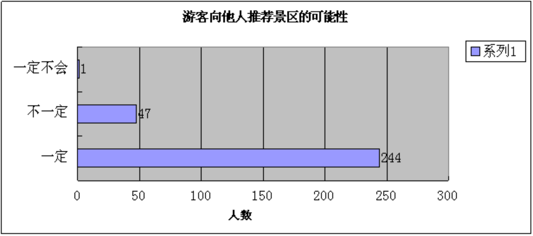 游客在对于景区的整体印象评价的基础上,对于是否再向他人推荐该景区的可能性做出了客观的评价,数据统计结果如图4-2所示, 表示一定会向他人推荐的游客数有244人,占比84%,不一定会向他人推荐的人数占比16%,占得比例较少。这显现出我们的游客源的潜在性还是很大的。说明了我们景区给游客们留下了深刻的观光感受和难忘的记忆。