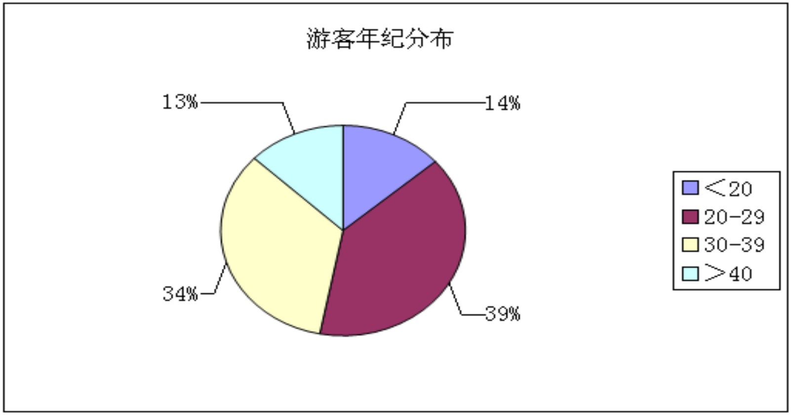 针对于游客的年龄组成,分成了四个不同的阶段做了扇形概率统计分析,分别是小于20岁,20到29岁,30-39岁,大于40岁的年龄组比。如图1-2,该图反映出小于20岁的游客占总比为14%,20-29岁的游客占比39%。30-39岁的游客占比34%,大于40岁的游客占比13%,从扇形图中的分析结果统计得出,此次游客的年纪结构比例相对比较均匀,集中在青少年年龄层次中的游客数占比较多,总比占73%。足以显现出我们的景区越来越受到青少年的喜爱。所以在以后的工作目标中,我们可以考虑到针对于青少年们的互动和游览项目,争取吸引到越来越多不同年龄结构的游客人群,使得园区达到“门庭若市”的场景。
