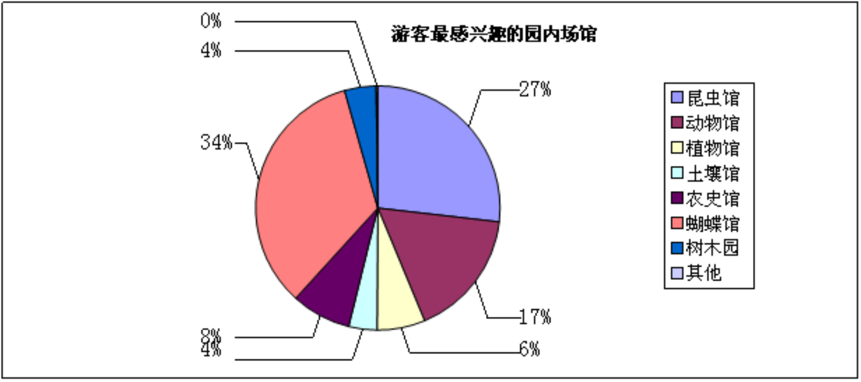 此次游客感兴趣的场馆调查采取是多项选择的形式,根据游客游览完景区的感受来做统计,由图3-2不难看出,蝴蝶园占比最高,为34%,昆虫馆次之为27%,接着是动物馆17%,最后依次为农史、植物馆和土壤馆。整体来说游客所喜爱的场馆集中在蝴蝶园和昆虫馆,有变化的是以往的昆虫馆是最受喜爱的,而这次的统计数据显示最受游客喜爱的却是蝴蝶园。这与人们越来越喜欢大自然,追求一种和谐的生活方式有关,现在无论什么新闻报刊都宣传生态和谐,回归大自然与自然界的生物友好相处的理念,当然人类文明的进步也伴随着和谐的发展。人们更愿意亲近原生态的食物,与他们零距离接触,蝴蝶园,一个蝴蝶们的乐园,人们畅游其中,时不时会有蝴蝶落到他们的肩上、头发上、手背上等等,一切的景象看起来是那么的和谐生动。这也难怪人们对于她的青睐,昆虫馆是目前世界上最大的昆虫收藏馆。是集趣味性和知识性于一体的游览场馆,主要接待的是家庭出游的游客,尤其是带有孩子们的家长,对于他们来说,这就是个栩栩如生的校外课堂。当然土壤馆是游客们最不感兴趣的,分析其原因更多的是在于农业历史的专业知识性太强,且缺乏场馆内的互动,比如问答环节等等,使得人们会感到枯燥无味。