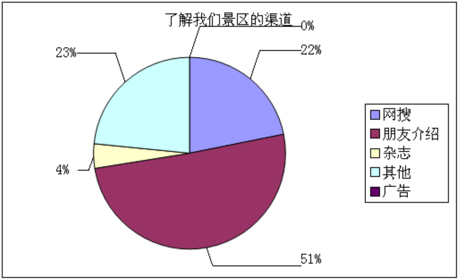 此次针对于游客通过什么样的渠道了解我们景区的调查分为五大方面进行了数据统计,参与的方式有网络搜索、朋友介绍、旅游杂志、电视广告和其他内容。如图1-3,其中朋友介绍的人数居多,为160人。这跟往年的调查结果一致相符,我们的景区还主要是以口口相传的宣传方式吸引更多的潜在游客,这也从侧面反映出游客们对我们园区的服务和特色留下了深刻的印象,增长了我们要将服务跟特色做的更好的信心。网络搜索居其次。说明网络上的宣传作用日益发挥着重要的作用,当今科技的发展,尤其是电子信息技术的快速发展,使得人们了解外界信息的途径变得简洁而快速。因此对于旅游地理信息的宣传途径,我们选择网络是奏效的。毋庸置疑,网络宣传具有传播范围广、交互性强、针对性明确、灵活且成本低的特点。因而新高科技的推广力度下,比如对于西北农林科技大学博览园的官方微信的关注,游客们通过现在很热门的微信扫一扫的功能及时有效地了解我们园区的各类信息资源,给我们的客户端增加了更多的粉丝量,达到推广的目的。通过杂志了解我们景区的占比是4%,这种传统的媒体因为具有出版的时间性和发放的不连续性,并不是很受游客们的青睐,当然这也就不能取得显著的宣传效果。因此建议以后随着时代的进步,我们要多多鼓励网络宣传,增加各种形式的网络互动和优惠性的活动,拓展市场宣传,增加我们在全国的游客数据源。