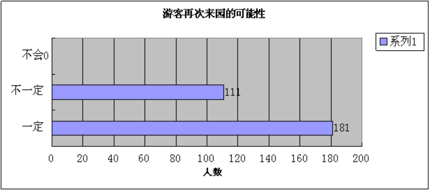游客是否再次来园是反馈我们景区各方面服务的一块试金石,同时也是起到一种潜在的客户源的带动作用的,如图4-1,游客表示再次来园人数达到181人,占比62%。不一定人数是111人,占比38%。这项数据表明园区在游客心目中留下了深刻的印象,他们表示对于景区还会再来的可能性比较大。