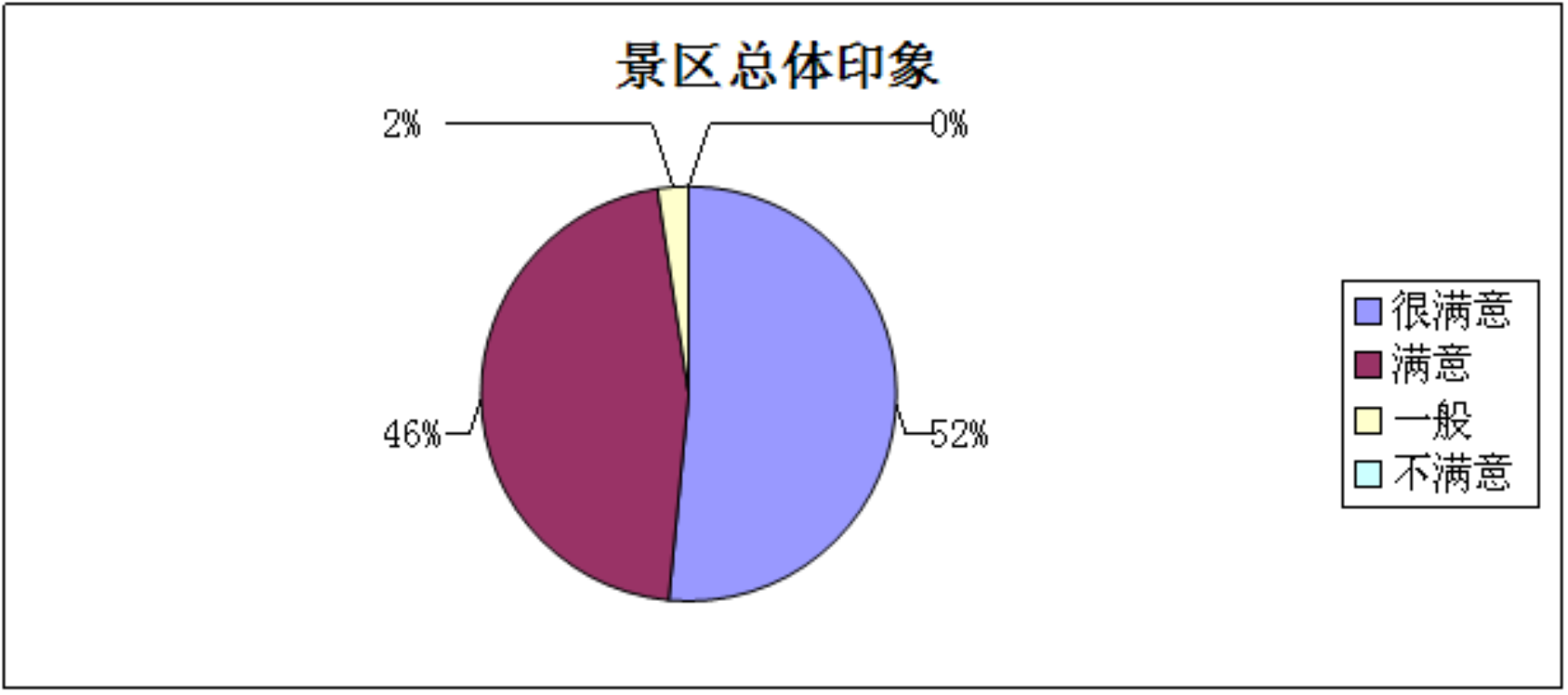 对于景区整体印象的评价,划分为了四个等级,很满意、满意、一般和不满意。调查统计结果如图3-5所示。很满意占比52%,满意的占比为46%,一般性评价占比2%,不满意为0。所以游客对咱们景区的整体印象是很满意的。这也给我们之前的工作给予了很大的肯定和支持,同时激励我们对以后园区的建设和管理工作要加大力度和投入更多的精力。旅游业的发展考的是服务,创优质服务,让游客满意,是我们不断努力的目标,源源不断的动力来自于游客对我们工作的认可,所以任重而道远,为创收更好的景区经济效益共同努力。