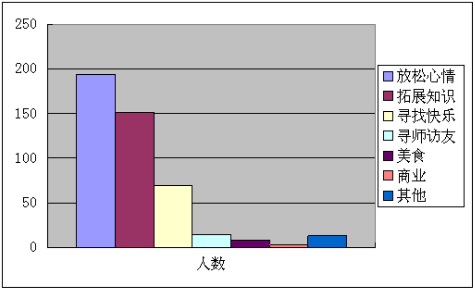 在端午节期间,相对于游客旅游的目的性调查包含以下内容:放松心情、拓展知识、寻找快乐、寻师访友、品尝美食、商业目的和其他的方面。在参与问卷的游客当中,如图2-2所示,放松心情是大多数游客来此景区的主要目的。其次是拓展知识,分析其原因主要是在于现在人们的生活压力越来越大,社会竞争加剧,人们利用节假日的休息时间,出来进行个短期的放松旅行,使得自己有个更好的生活工作状态。所以去景区旅游是人们放松的首选,博览园作为集中科普知识与生态旅游于一体的景区,让人们在休闲度假的同时,带着自己的孩子或者父母储备知识,在快乐中学习,在学习中成长。这就是我们博览园的旅游目的意义所在。其中的品尝美食和商业目的的占比较少,就美食而言,我们景区附近的美食街不够明显,大多数游客反映,当他们想吃点当地的特色小吃时,我们的特色店面却不是那么的显眼,所以我们还需要努力做的工作是,能够集旅游娱乐科普饮食于一体,用景区带动饮食文化,用饮食文化促进景区的收益,达到相得益彰的目的。