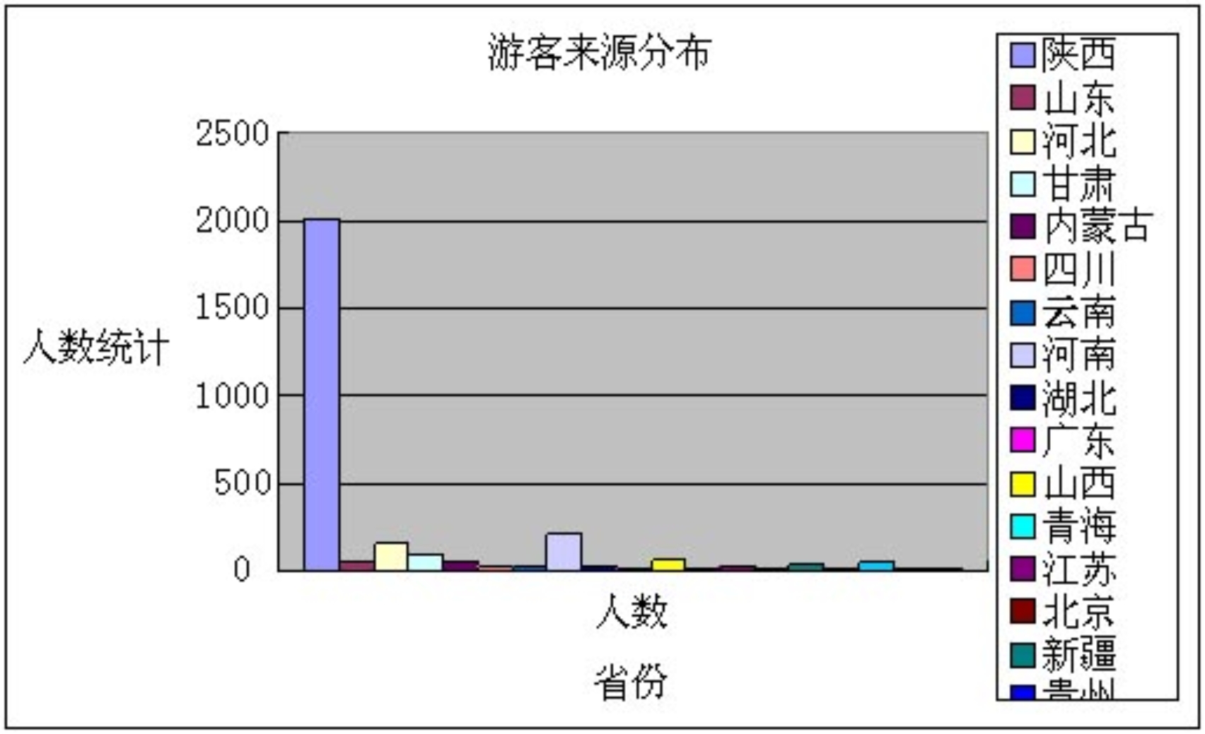 在1632份调查问卷中,按照游客来源地的区域分布情况总结如下:参照图1-1,陕西省占有1200份,是所有来访旅客中人数最多的。河南省21份,仅次于陕西本地游客数量。河北省16份,居于排名第三位。甘肃省10份。山西7份,山东内蒙古和宁夏都是5份。四川、云南、湖北和江苏仅占3份。来自于广东青海等的游客各只有2份,另外北京贵州重庆和海南的游客各是1份。据此我们做出了条形图,很清晰的反映出目前游客的地域性分布还是很不均匀,主要是集中于陕西本地游客。对于外地游客的接待数量很是欠缺。这反映给我们的信息是:我们仍旧需要研究进一步扩大宣传园内的特色的策略,开拓省外的市场,调动起外省的资源,刺激消费带动经济发展,达到园内营销目标。