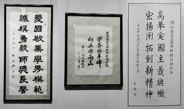 第九届全国政协委员、十届全国政协常务委员、十一届全国政协副主席、农工党中央常务副主席、西北农林科技大学原校长陈宗兴为周尧昆虫馆新馆题词(左);国务院参事、政协第十三届全国委员会农业和农村委员会委员、中国林业科学研究院首席科学家杨忠岐为新馆题词(中);西北农林科技大学昆虫学家袁锋教授题词(右)