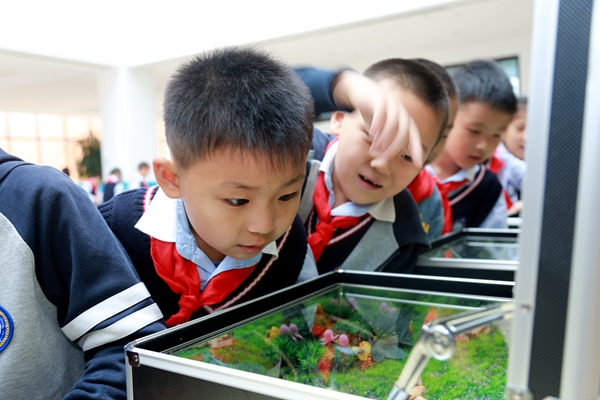 在一楼大厅,近40台包含声学、电磁学、光学等科普互动仪器、《极地动物》、《生命之水》3D科普展板及仿生机器人为同学们带来了一场丰富的科技体验,由博览园昆虫科学传播专家工作室自主研发的15台“伪装大师”“昆虫歌手”系列科普展品更是成为现场焦点,同学们在观看时惊讶不已,纷纷寻找伪装的昆虫,戴骨传导耳机聆听昆虫鸣叫。通过此次活动,让同学们与自然科技零距离接触,了解和亲身感受自然的魅力,并有助于培养学生热爱自然、保护环境的意识,培养和激发他们学科学、爱科学的兴趣和热情,提升青少年科技创新意识和科技创新能力。