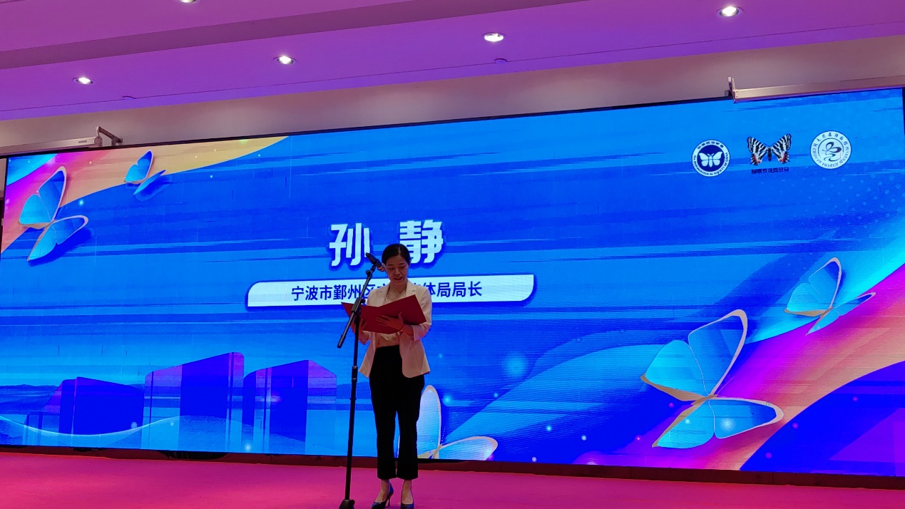 宁波市鄞州区文化和广电旅游体育局孙静女士致欢迎词,作为"中国蝴蝶文化之乡",鄞州共有大大小小博物馆25家。为了弘扬周尧先生爱国、敬业、创新的崇高精神,积极推进昆虫科学的普及,鄞州区于1996年6月在宁波东钱湖畔建成周尧昆虫博物馆。2022年7月28日,周尧昆虫博物馆新馆于鄞州区核心地段鄞州公园开馆,九三学社中央原主席、中国科协名誉主席韩启德院士亲笔题写馆名并亲临现场致辞祝贺。博物馆开馆后吸引了大量观众前来参观,被誉为宁波最难预约的博物馆,获评全国科普教育基地、国家级科学家精神教育基地等七个省级以上荣誉,成为昆虫科普和蝴蝶文化的新地标,在推动区域蝴蝶文化传播和青少年科学文化素养提升方面成效显著。