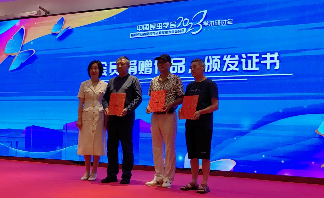 在本次研讨会开幕式上,会员陈敢清、刘建明、侯旭、薛巍、胡晓红等向周尧昆虫博物馆捐赠了82幅蝴蝶摄影作品和6件蝴蝶艺术品,宁波市鄞州区文化和广电旅游体育局副局长陆维女士代表周尧昆虫博物馆向他们发放了捐赠证书。在会议现场展出了部分精美的赠品以及昆虫科普视听系统。在周尧昆虫馆二楼展出了本次研讨会的所有摄影作品。