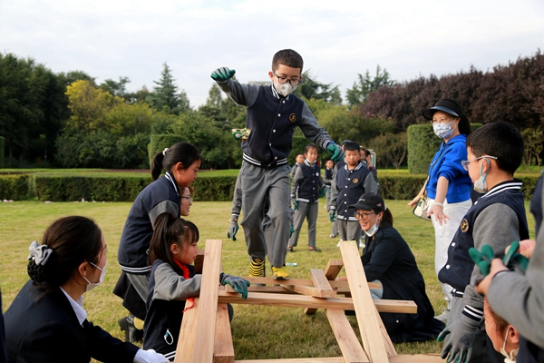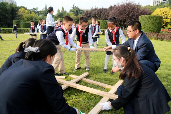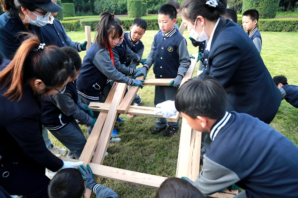 在紧张刺激的竞赛中,同学们开动大脑,动手搭建