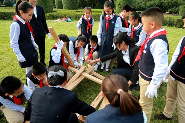 “小木匠 大智慧”周末开放课共分为4个环节,一是体验榫卯结构,学习我国优秀传统文化,通过榫卯的拼接体验,感受中国古人的伟大智慧。二是学习微型倍力桥的搭建,锻炼耐心,提高专注力,激发学生对科学的探索精神。三是团队竞技,通过游戏挑战的方式,体验倍力桥的结构和搭建技巧,培养学生的团队合作精神。四是竹蜻蜓的飞行原理和制作,利用树枝做创意,让学生们了解,美来自于自然,创意来源于生活。